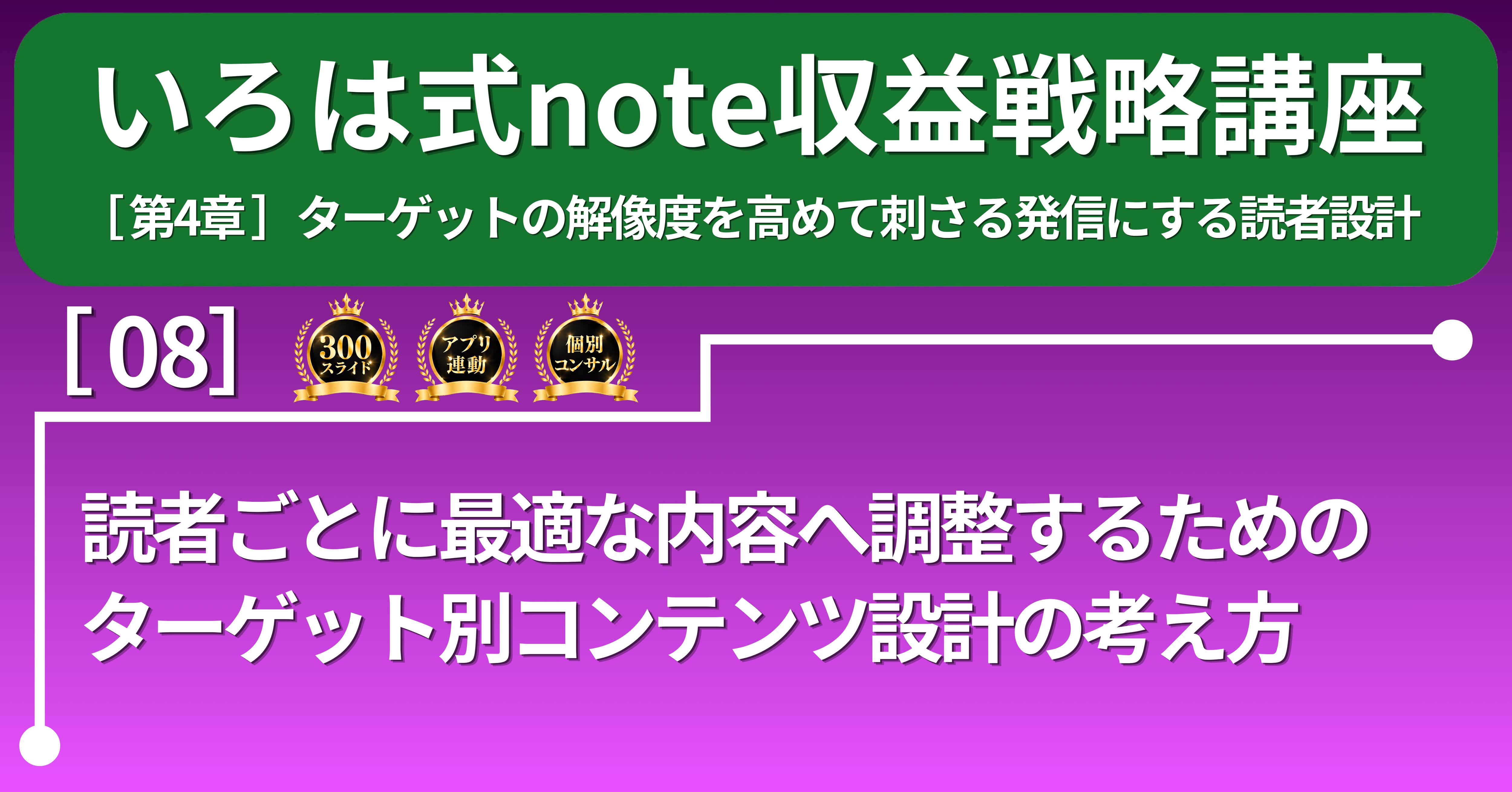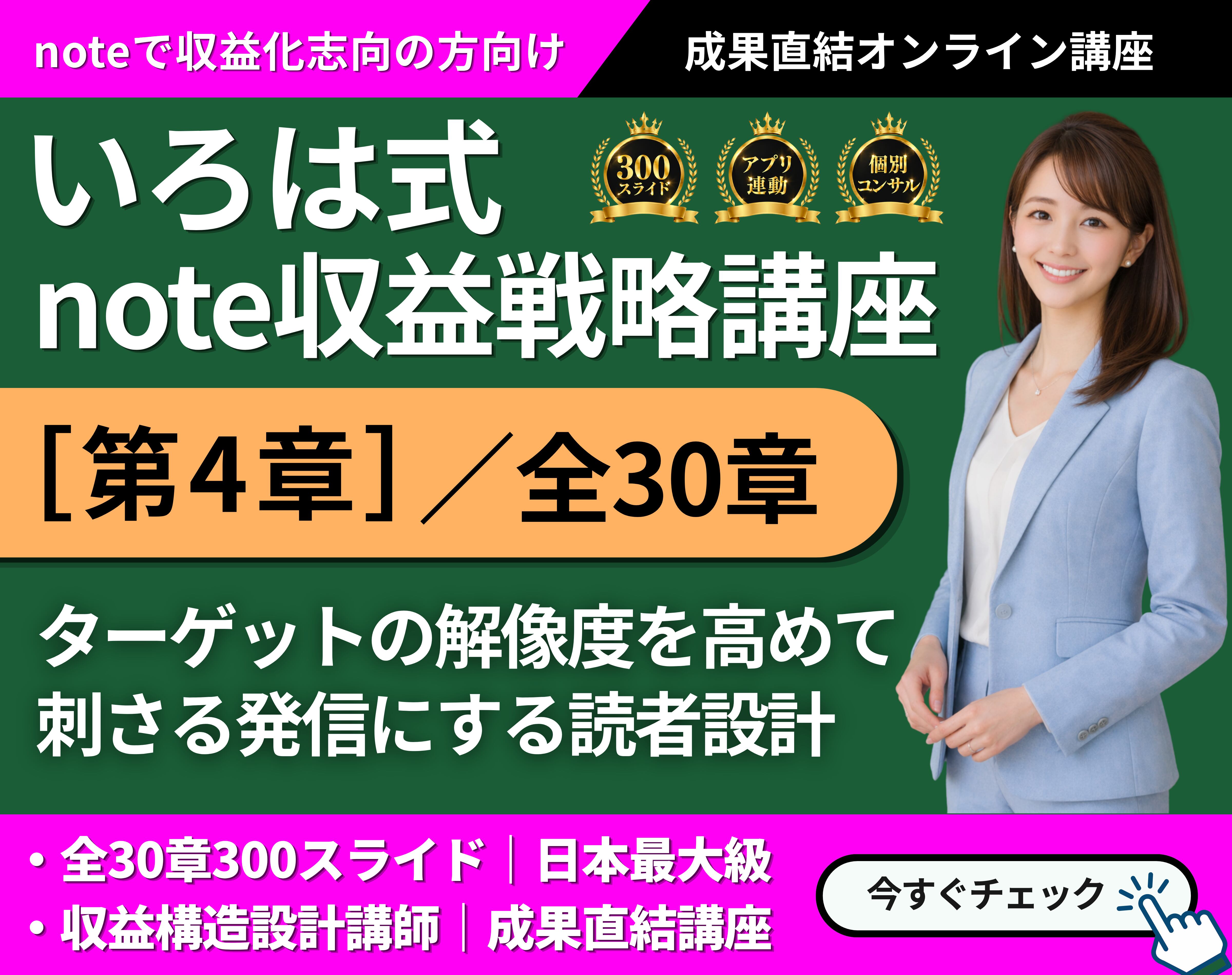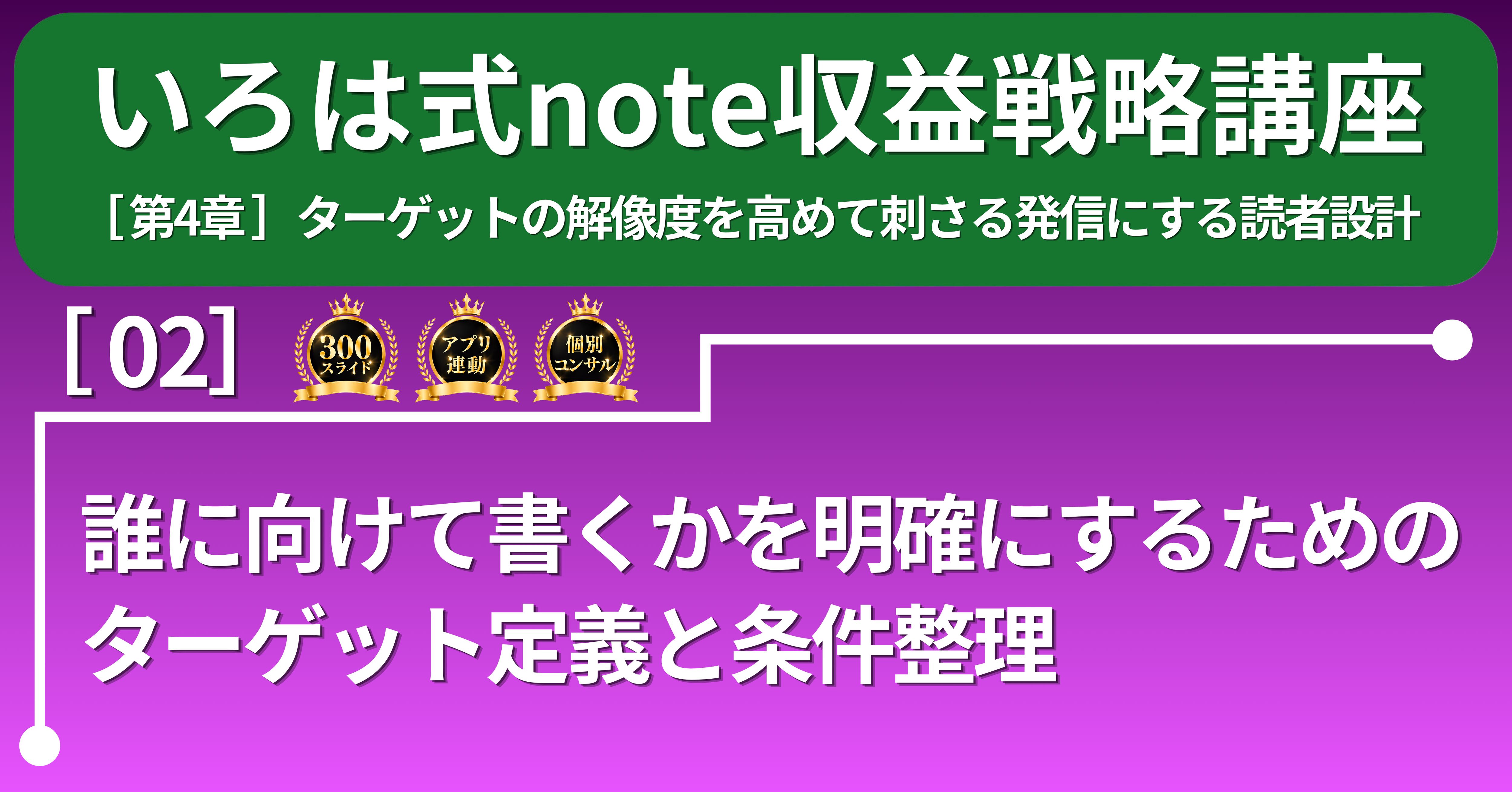 いろは式note収益戦略講座[第4章]ターゲットの解像度を高めて刺さる発信にする読者設計|✅視覚理解×実践設計のスライドカリキュラム [全30章・300講義]
